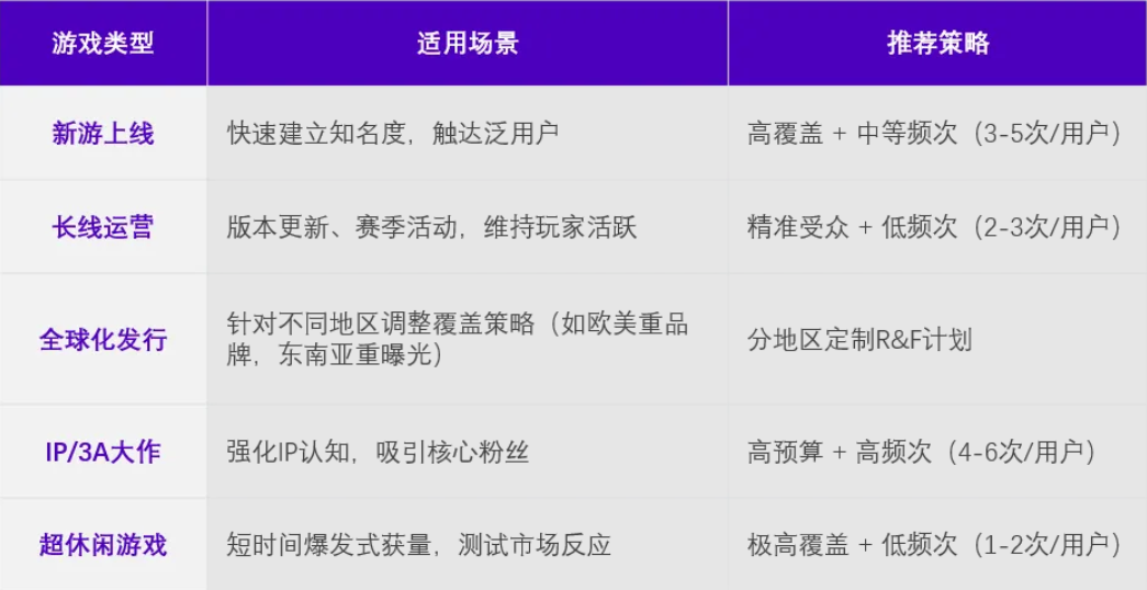 可设定用户看到游戏广告投放的最高频次(Frequency),避免同一用户过度曝光,减少广告疲劳。